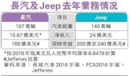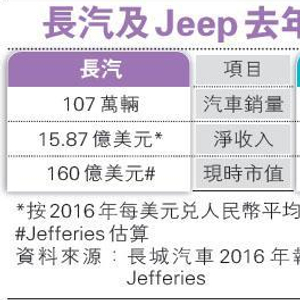 分析相信,一旦收购成事,将有助长汽业务发展。Jefferies分析员Patrick Yuan认为收购对双方皆为正面,该行报告指,长汽占中国SUV市场10%至12%,为市场领导者,惟去年销售仍低于Jeep(见表),收购后长汽的SUV销售将增1倍,有助更快成为全球SUV领导者。此外,长汽SUV在高价市场销售不理想,新推出品牌WEY的前景仍未明,Jeep有助完善高价市场竞争力。