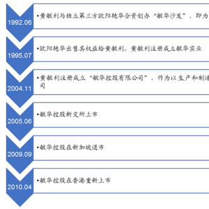 第一阶段,敏华控股成立:1992年6月,黄敏利与独立第三方欧阳艳华合资创办“敏华沙发”,即为“敏华控股有限公司”前身,二人各持有敏华沙发50%股权。公司成立之初共有三名员工,主要在香港从事沙发销售业务。2004年11月,黄敏利注册成立“敏华控股有限公司”,作为以生产和制造沙发及木制家具为主营的控股公司。