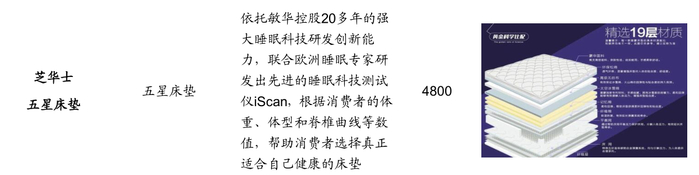 除沙发外,床垫业也开始扬帆起航,芝华仕5星床垫是敏华控股旗下驰名品牌芝华仕高端床垫系列,致力于为千家万户提供舒适、健康、尊贵的5星睡眠享受,并广泛运用于五星级酒店、豪华游艇、私人会所等高端领域。