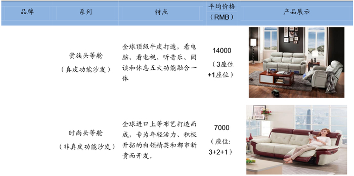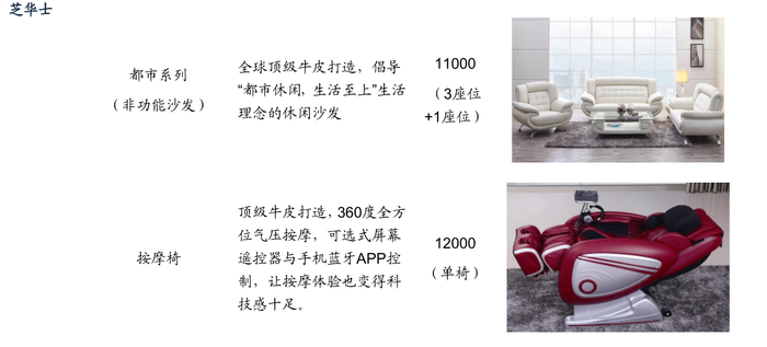 目前,公司旗下拥有四个系列主打产品,客户有效覆盖社会各阶层。为了满足全球不同消费者家居需求,芝华仕沙发推出了贵族、时尚、都市三大系列。贵族与时尚系列为能给人带来舒适享受的功能沙发——芝华仕头等舱沙发,芝华仕都市系列为外形线条简洁、设计感强的非功能性休闲沙发。芝华仕头等舱沙发更连续多年稳坐中国功能沙发销售第一品牌。除在中国市场取得成功外,芝华士亦成为唯一进入美国主流家具市场的中国家具品牌。