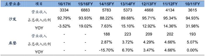 公司主要从事以沙发为主的软体家具的研发、设计、生产与销售,主要产品包括沙发、床垫、定制家具和配套产品。公司有三大知名品牌“芝华士”、“爱蒙”和“名华轩”,分别对应功能沙发、健康床垫和定制家具,其中,沙发是公司的主营产品,收入占比达90%以上。芝华仕沙发是敏华控股旗下最具影响力的家居品牌,也是全球沙发行业的领导者。自创立以来,芝华仕沙发始终专注于品牌全球化发展战略。目前,芝华仕沙发在中国拥有近1000家品牌专卖店,在全球拥有超过3000个销售终端,产品畅销美国、英国、加拿大、中国等50多个国家及地区,运营网络横跨亚、美、欧、澳四大洲。其产品广泛被运用于高铁、机场、酒店、游艇、高端会所、影院等多个领域。成立之初,芝华士将产品定位于中高端收入人群,由于市场及经济的整体波动,公司开始考虑多元化发展,产品单价下调。