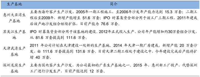 公司是中国产能最大的沙发工场,拥有沙发核心工序,沙发生产程序械架、电机和海绵等独立生产能力,是从生产链基层开始设计和生产沙发。公司在家具市场上拥有话语权,在研发和生产上建立了高壁垒和核心竞争力,不仅保证产品品质,而且优化成本结构。积极扩张产能,完善供应体系:公司在深圳、惠州、天津和吴江均设立生产基地,深圳目标华南市场,惠州目标北美、欧洲及亚洲等海外市场,天津目标北方地区,吴江目标华东和华中地区。公司现产能131.6万套沙发,平均年利用率可以达到70%,2016财年上半年实际销售46.5万套。惠州新厂2016投产,产约为12万套沙发。在新厂投产后,我们预计公司产能进一步扩大,不仅增厚营收,且在规模效应下提高盈利能力。