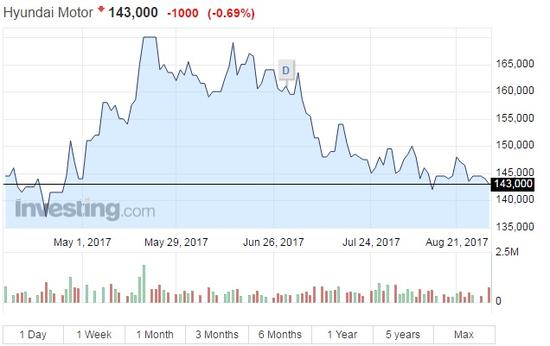 Heungkuk Securities的分析师Park Sang-won表示,尽管中国产量下滑带来的影响仍不确定,但是现代汽车三季度的业绩极可能由于中国区持续未达预期的销量而再度刷低记录。而现代的股价也在销量业绩不尽如人意的背景下自6月起连连走低,距离6月高位已跌去约15%的市值。