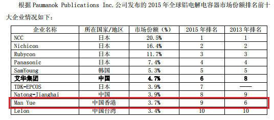 根据艾华集团(603989.SH)2015年年报(公司是一家同样以铝电解电容器为核心业务的A股上市公司),万裕科技的全球铝电解电容制造商排名由2013年第6位跌至2015年第9位。公司业绩逐年倒退,同时亦反映在排名上。