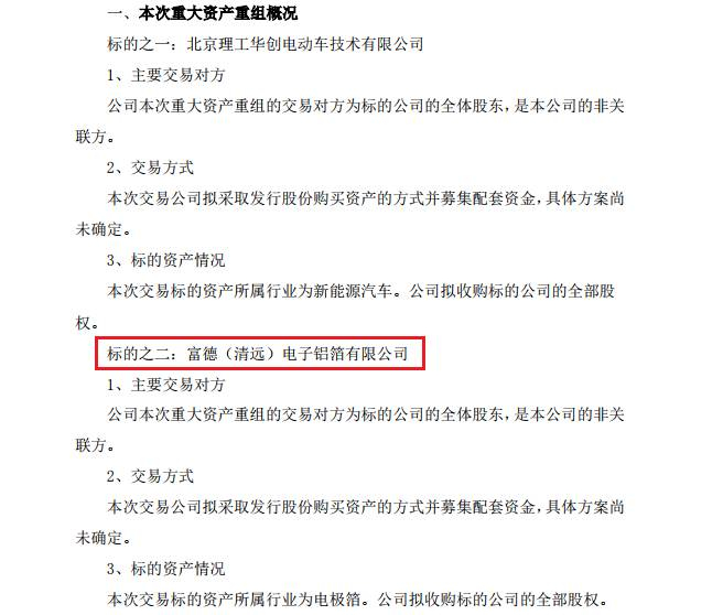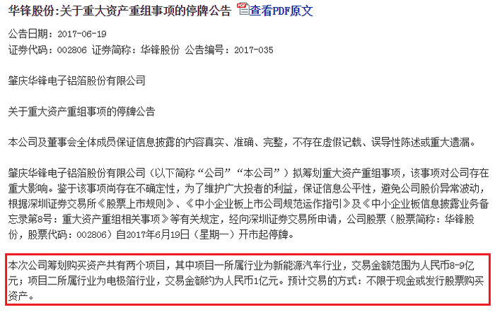 公告内容关于华锋股份正筹划购买资产共有两个项目,一个8~9亿元新能源汽车项目,一个1亿元电极箔项目,不限于现金或发行股票购买资产。