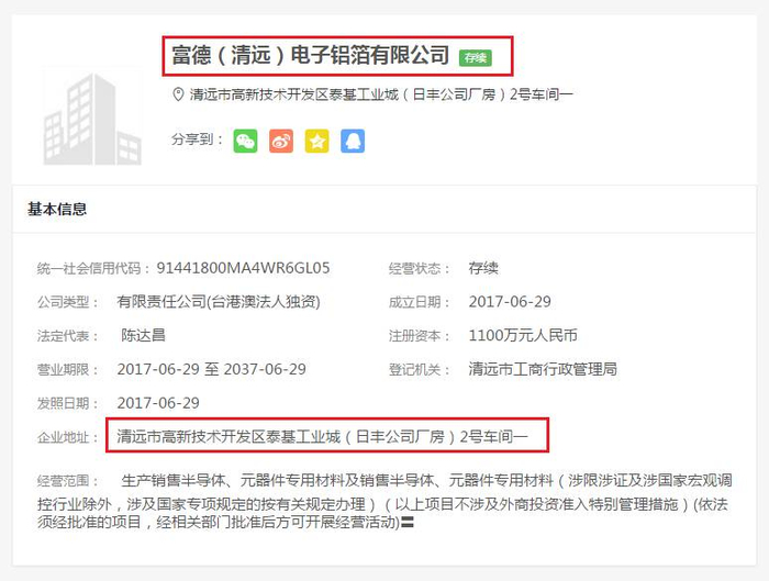 其后,华锋股份于7月13日发布更多详情,披露电极箔项目为富德(清远)电子铝箔有限公司。我查阅网上资料,富德(清远)属于万裕科技位于清远的铝箔厂房内(即日丰(清远)电子有限公司)。