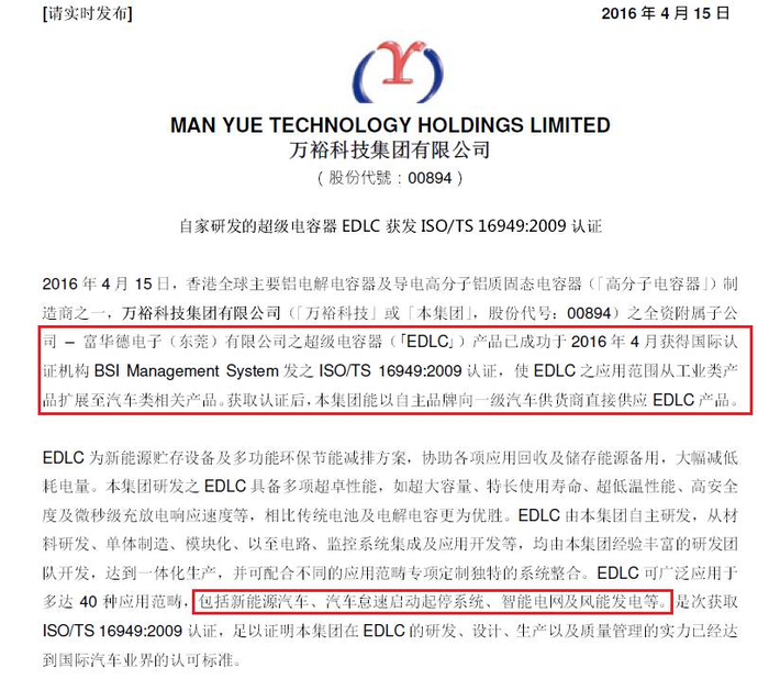 这次华锋股份停牌除了收购万裕科技的铝箔资产之外,其主菜应该是收购新能源汽车资产。而万裕科技于多年前布局的超级电容(亦称双电层电容或EDLC)恰好能应用在新能源汽车上。