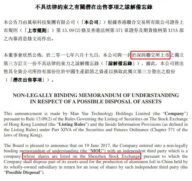 万裕科技于6月19日发布公告称:“万裕科技与一名于深圳联交所上巿的独立第三方订立一份不具法律约束力的谅解备忘录,即公司或将出售其全资公司所持有部分位于中国生产铝箔的资产,以换取独立第三方发出之股份。”