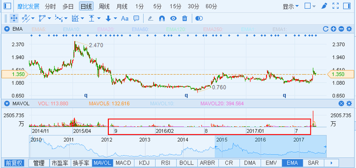 智通财经了解到,在2017年9月4日,摩比发展股价涨幅11.86%,次日再涨达15.15%,成交量异常放大,当日成交金额5111万港元,换手率达4.12%,两个交易日合计涨幅28.8%。实际上,近两年来,摩比发展的股价成交量很低,大部分时间日均成交金额仅几十万港元,不过这两根大阳线后,该公司股价就进入了调整状态。