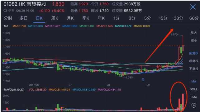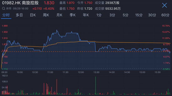 与恒指的步调相似,部分前期涨幅较大的板块或个股也开始调整。但智通财经APP注意到,9月以来,有一只股票先是缓步上涨,然后在该月的尾巴踩下油门,加速攀高——9月最后三个交易日累计涨幅达12.96%,9月整体涨幅达25.34%,屡创上市以来新高。这只股票就是南旋控股(01982)。