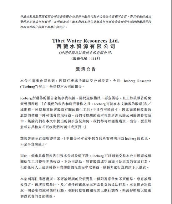 西藏水资源今天下午迅速做出回应。西藏水资源公告称,Iceberg所发佈的报告毫无事实根据,属於虚假指控、恶意误导。且正如该报告的免责声明所述,“在我们的报告和研究发佈之日,Iceberg可能在本文涵盖的股票(和/或期权、掉期和其他与股票有关的衍生工具)中具有空头头寸因此如果被覆盖的股票的价格下降可能会实现收益。我们可以继续在本报告所涉及的公司的证券交易中,无论我们在本文中提出的初步意见如何,我们都可以通过购买、出售、覆盖短仓或以其他方式更改我们的头寸或实质。”该报告的免责声明亦指出,“本报告和本文中包含的所有声明均为 Iceberg的意见,不是事实陈述”。