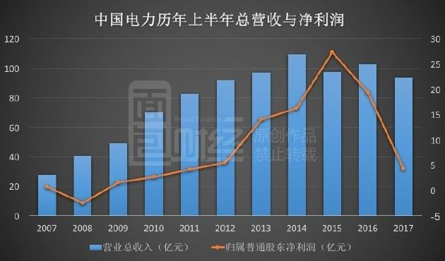 事实上,2016年上半年,中国电力净利润就已经下跌29.4%。下图为面包财经根据财报绘制的中国电力历年上半年总营收与净利润: