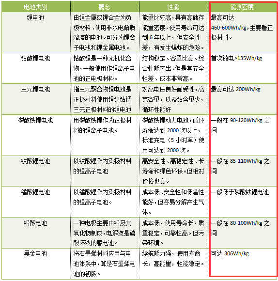 按照新的新能源补贴标准,非快充类纯电动车客车80Wh/kg就可以享受补贴,而能源密度在这范围的各类电池大都可以达到,其中就有应用较广的磷酸铁锂电池。以性能来说,黑金电池、磷酸铁锂电池以及三元电池较其他好,能量密度也高,其中三元锂电池能量密度可达200Wh/kg,但在成本上,锰酸锂电池具有一定的优势。