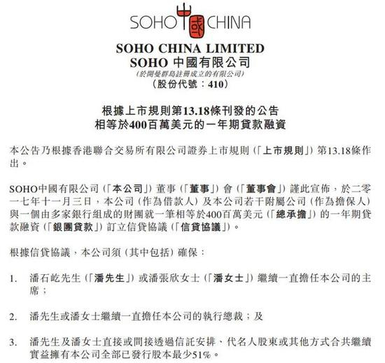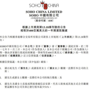 SOHO中国获银行财团提供4亿美元贷款 并签订贷款协议