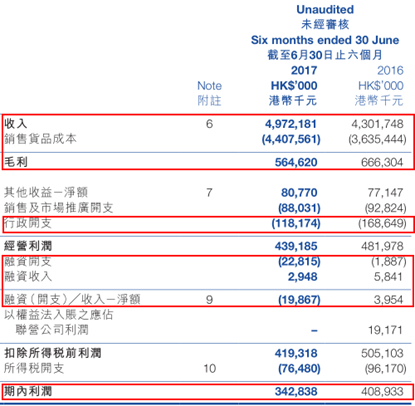 然而随着公司半年业绩披露的临近,股价开始一路下滑,公司于8月23日发布2017年中期业绩公告称,集团上半年实现营业收入49.72亿港元,同比增长15.59%,但是公司拥有人应占溢利3.43亿港元,同比减少16.25%。