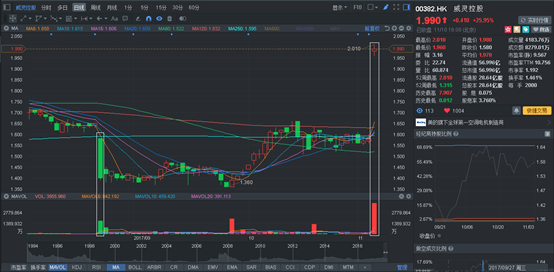 威灵控股股价从2017年初1.36港元的水平,一路稳健上行至年中高点的1.88港元,涨幅近38%。
