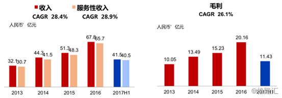 财务数据方面相信大家都有一定的了解了,公司上半年还是持续保持了高速的增长,收入是41.45亿元,同比增长43%,净利润是接近2.5亿元。净利润的增速和收入比没有那么快,主要是去年年底发了比较大的期权费用,扣除掉期权费用,我们的净利润同比增速超过30%。我们公司从2003年创业板上市以来,每年都保持了高速的增长,收入年复合增速是43.9%。从当前来看,无论是从收入规模还是从人员规模看,中软国际是IT领域的绝对龙头。