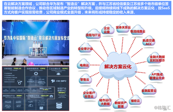 公司在5月份推出了第一个云解决方案是“智造云”,“智造云”是什么呢?就是一个云化了的智能制造的服务平台,它解决的立足点是改变制造企业由过去的流程驱动变为数据驱动,提升制造企业的智能水平和效率,最终提升他们的盈利水平。这个“智造云”推出来之后,也是在这几个月的时间里面形成了快速拓展的阶段。我们在江苏省跟徐州,昆山都签下了战略合作业协议,目前首批两千家制造业用我们的“智造云”基础版本。除了这些中小企业,还不乏一些大客户成为了我们的伙伴,比如说红塔、中国烟草和海天集团等等。