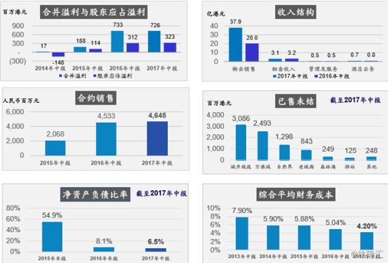 简单过一下业绩的状况,本期利润是7.26亿港元,今年同比上升8.29亿港元,股东盈利上升3.22亿港元。到2017年9月末期间,合约销售已经达到70个亿人民币,在拿地方面,在上海市拿了办公室用地,大概是10万方的土地,成本大概是2.58万人民币每平方米。资产优质方面,手头现金大概是130亿港元。盈利状况。股东盈利从2014年开始不断上涨到3.2亿港元左右,收入结构主要是来自于物业销售,超过80%是来自于物业销售,合约销售中国是46亿,9月末是70亿人民币左右。已售未结是83亿港元,负债比例是从2015年不断下降,平均的财务成本也是不断的下降。中报的状况,收入是42亿港元,毛利是21亿,毛利率是50%,因为上半年都是来自于上海区域,上海那边的毛利率达到50%到60%左右,后面可以看到我们的比重在上海上半年比较多,所以毛利率偏高,但是全年大概是在40-50%之间的毛利率。年内应力是7.26港元,基本的盈利是6.71,我们的总资产是583亿港元,手头现金是130亿,可以看见我们每股资产净值是2.65港元,现在是严重低估的,同时2016年末也有派息,派息比率都是超过33%左右,从2014年开始派息到2016年,每年都是30-40%之间,所以我们会比较平稳的增长派息。