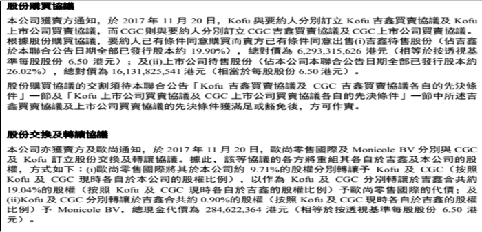 第一,折价发行,根据高鑫的公告,阿里直接和间接持有高鑫36.16%的股份,每股要约收购价6.5港元,较高鑫停牌前的收盘价8.6港元,折让24.42%。