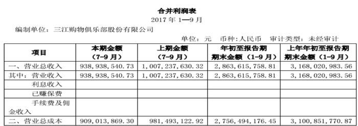 三江购物2017年三季报显示,公司2017年前九个月的营业总成本为27.56亿元,同比减少24%,今年第三季度公司营业总成本为9.09亿元,同比减少7.34%。