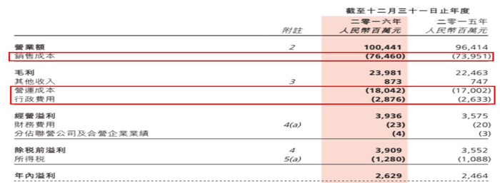 尽管营业额突破千亿,但2016年高鑫零售仅实现净利润25.71亿元,主要是由于成本及费用增长较快,其销售成本、营运成本和行政费用总额为973.78亿元,同比增速分别为3.4%、6.1%和9.2%。