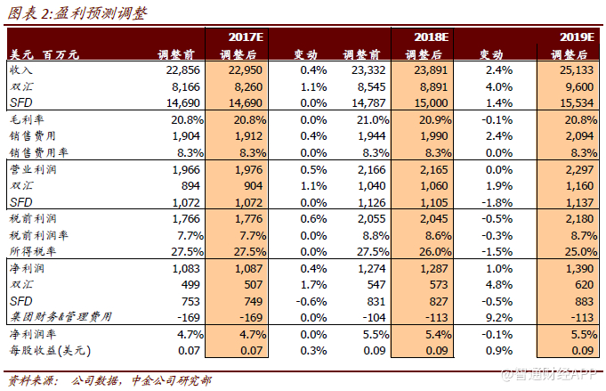 此外,中金预计派息率有望维持在50%左右,主要考虑假设2017-18 年资本支出5 亿美元,年均自由运营现金流可达10亿美元。收购东欧公司未计入资本支出,且预计开支不超过5 亿美元;短期内尚无重大收购计划,中金认为自由现金流强劲能够支撑短期派息率50%。