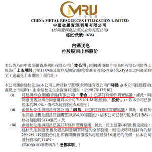 中国金属利用(01636-HK)主席及执行董事俞建秋在12月8日,以每股3港元的价格悉售所持股权。中国金属利用业绩扭亏,接连得到大笔资金援助,在前途变明朗之时,主席套现离场?
