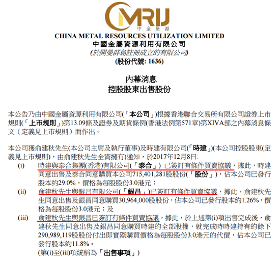 俞建秋同时也是中国金属利用创始人,透过个人权益和时建的股权持有约42.05%的股权。公告称,其持有的时建向泰合集团(香港)有限公司出售约7.15亿股,占已发行股本约29%。俞建秋向银昌有限公司(为间接全资附属公司的一名董事全资拥有)出售约3096.4万股,占已发行股本约1.26%。紧随时建向泰合集团(香港)完成出售后,银昌将向俞建秋收购时建持有的余下约2.91亿股股份,占已发行股本约11.8%。
