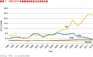 在现有能源结构中,核电因其能力密度高、容量系数大、运行稳定的特性,被认为是极具竞争力的清洁能源,曾是替代对化石能源的最佳选择。在美国,在运核电机组成本最低为2.4美分/千瓦时,普遍低于煤电、天然气等其他能源的发电成本。