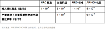 第三代核电技术的安全性呈数量级的提升。下图数据可以得知,以AP1000为例的第三代核电机组安全性上有极大程度的提高,完全满足美国核管会NRC与美国核电用户要求文件所制定的标准。