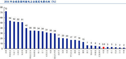与其他国家相比,我国核电仍有较大的发展空间。从2016年的世界各国核电占总发电量的比重来看,全球前30国家的核电平均占比为23.8%,而我国的核电发电量虽在近三年增长快速,但占比仅3.6%,与美国、俄罗斯、英国、德国、韩国等国平均20%的占比差距明显,未来仍有较大的发展空间。