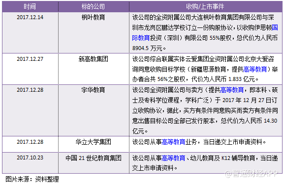 2017年12月份,在港股市场,出现了三起教育收购事件、一起教育申请上市事件,涉及高等教育事件占了三起,分别是新高教和宇华教育对高等教育标的收购,从事高等教育的华立大学上市申请。实际上,在2017年10月份,也有一所从事涉及高等教育的21世纪教育向港交所递交上市申请资料。