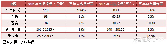 不过高等教育的区域布局也要看市场空间,市场先到先得,除了好的教育企业外,好的区域往往可以让市场占有方面获得巨大的优势。举个例子,比如以下为部分地区民办高等教育市场及前景情况: