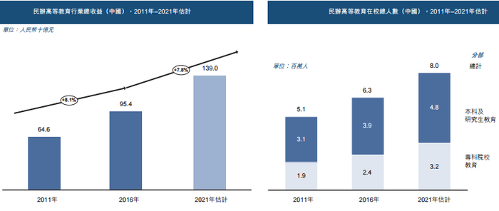 首先,我们还是要先看一下国内民办高等教育的现状,2016年民办高等教育市场规模为954亿元,比2012年增长37.1%,复合增长率达到8.2%,预计2021年市场规模将达到1390亿元。在学生规模上,民办高等教育2016年在校生人数为630万名,比2012年增长18.9%,复合增长率4.4%,预计2021年在校学生规模将达800万名。