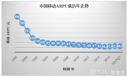 回顾中国移动近二十年的ARPU值走势如下图所示,ARPU值从1998年366元剧烈下降至2001年的145元,之后15年内缓慢下降至2015年的56.3元,并在2016年至2017年间有微幅上升的态势。从全球运营商ARPU值趋势看,ARPU值微降趋稳态势,约在88元人民币。那么未来中国移动的ARPU值该如何变化?
