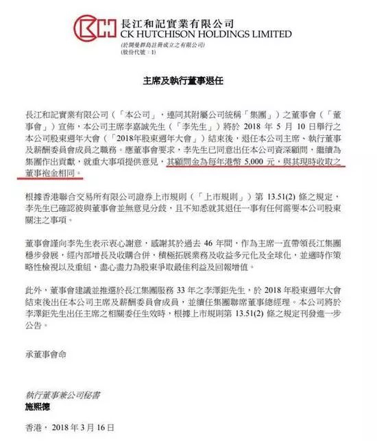 长和盘后在港交所发布公告称,年届90的主席李嘉诚即日起卸任董事会主席一职,长子李泽钜接棒。李嘉诚将继续担任李嘉诚基金会主席,并担任长江集团高级顾问,其顾问金为每年港币5000元。