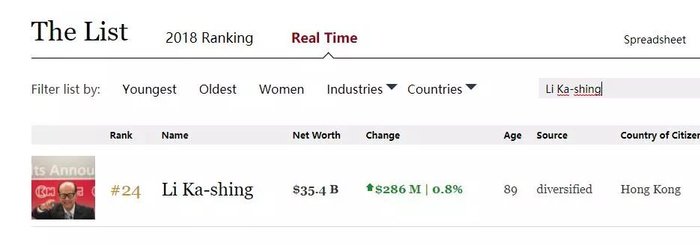 2017年7月17日,福布斯富豪榜发布,李嘉诚以净资产332亿美元排名全球第21位。