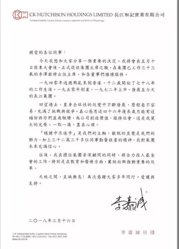 ▲李嘉诚退休信
