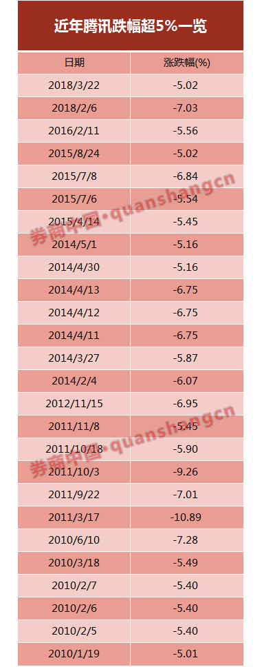 即使从腾讯2004年上市以来统计,也一共只有99个交易日单日跌幅超过5%,其中,仅有4个交易日跌幅超过10%。