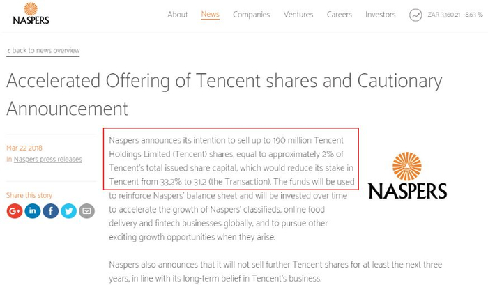 腾讯第一大股东Naspers官网发布声明称,将出售不超过1.9亿股腾讯股份,相当于腾讯全部已发行股本的2%,对腾讯持股比例将从33.2%降至31.2%。按照今天腾讯收盘价计算,这部分股份约价值834.86亿港元。