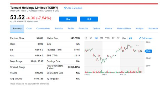截至3月22日晚10点,腾讯ADR下挫7.5%,报53.52美元。
