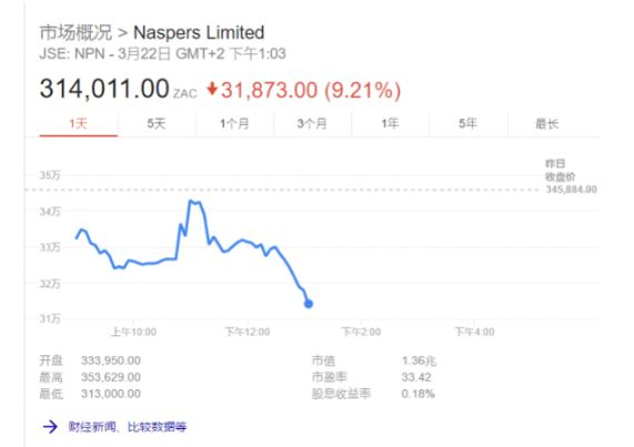减持腾讯股票对南非报业来说或许不是笔好买卖,当地时间22日,南非报业在南非交易的股票跌幅一度扩大至逾9%,为2008年10月以来最大跌幅。市值损失约100亿美元,这已经非常接近其减持腾讯股份所能套现的金额。