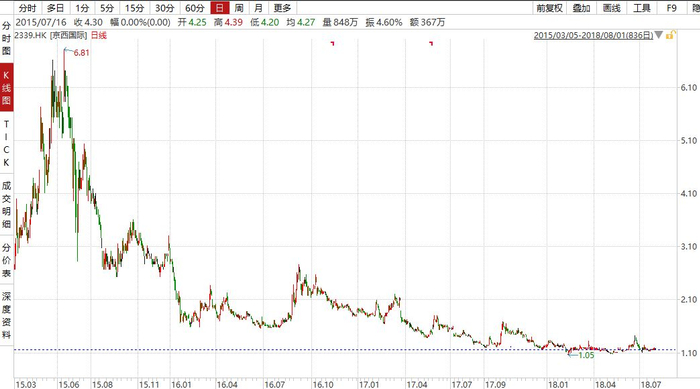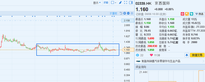 京西国际在1.1~1.2港币之间缩量横盘超过半年时间,即使在2月份的美股熔断和6-8月份的港股大跌中收盘价仍然保持在此区间,股价已是跌无可跌状态。