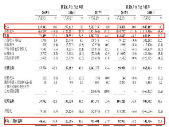 招股书显示,2015年-2017年以及2018年1月-6月(下称:报告期内),比特大陆共实现收入分别约为1.37亿美元、2.78亿美元、25.18亿美元、28.45亿美元,不仅连年增长,而且涨幅惊人;同期的毛利率分别为52%、54.5%、48.2%、36.2%,近两年成下降趋势,但仍维持在较高的区间;比特大陆的净利润同样表现不俗,报告期内分别约为0.49亿美元、1.14亿美元、7.01亿美元、7.43亿美元。按照1:6.87的汇率大致测算,比特大陆上半年实现净利润人民币51.04亿元,在3500多家A股上市公司的中报排行中,能够位列56位,优于同期A股98%的公司。