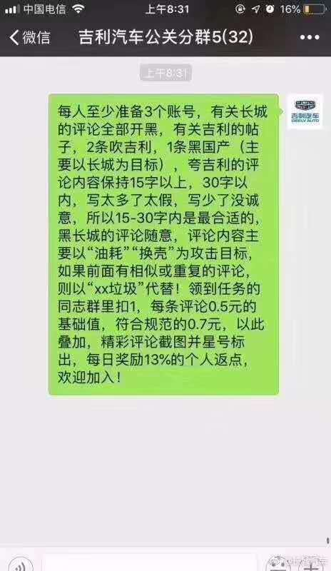 据了解,导致此次长城汽车公开发布声明的导火线是当天网络上散播一个名为“吉利汽车公关分群5”的微信群截屏,内容主题为号召水军在各大网络平台吹捧吉利,抹黑长城,当中还显示有具体的操作细节:每人至少准备3个账号,有关长城的评论全部开黑,有关吉利的帖子,2条吹吉利,1条黑国产(主要以长城为目标)。每条评论0.5元的基础值,符合规范的0.7元,以此叠加。