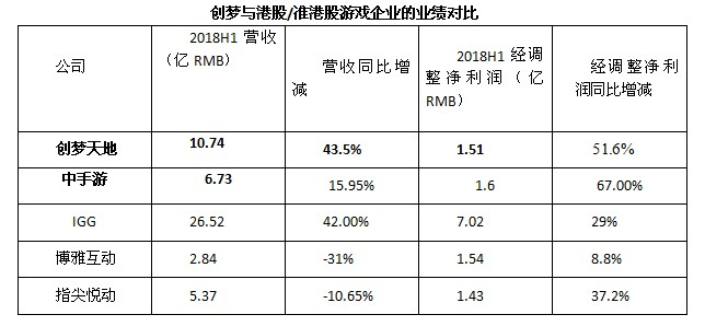 目前港股有23家港股游戏公司,如果仅以头部游戏企业作以比较,从上述四项指标来看,创梦天地营收和利润增幅高出同期港股/准港股游戏企业,并且是惟一一家能够实现营收和利润增速双双突破40%的企业,而10.74亿元的营亦让其超越了曾经的第一手游发行商中手游而荣登冠军宝座,后者2018年上半年营收6.73亿元。