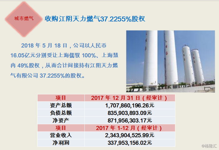 今年,大众公用收购了江阴天力燃气37.2255%的股权进行业务扩张,花费16亿。根据披露的经审计的财务数据,江阴天力燃气的经营业绩优异,2017年的收入及净利润分别达到23.44亿及3.37亿,2018年用气量增加预计收入还会继续提升。