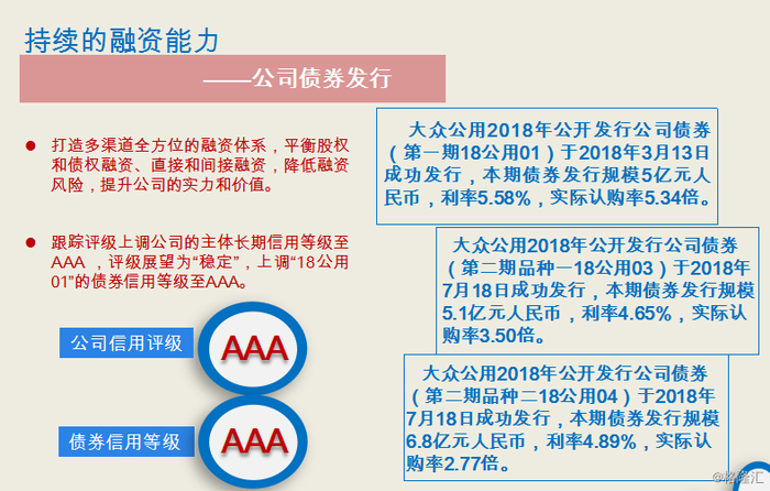 大众公用的利润来自于两部分,其中公用事业2.97亿(人民币,下同),金融创投服务1.48亿,近几年两部分的利润均保持了稳定性。值得一提的是,公司今年发行了公司债及短融,业务的稳健使得公司评级和债券评级都获得3A级,债券发行利率最低做到了4.65%,且认购倍数也比较高,公司的后续发展得到了良好的支撑。