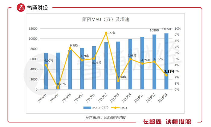 今日,陌陌公布了第3Q18财报。对于互联网公司,一般用户指标领先于营收指标,营收指标则领先于利润指标。因此要先关注用户指标,陌陌第3Q18MAU(月活跃用户)为1.105亿,环比增长2.31%。